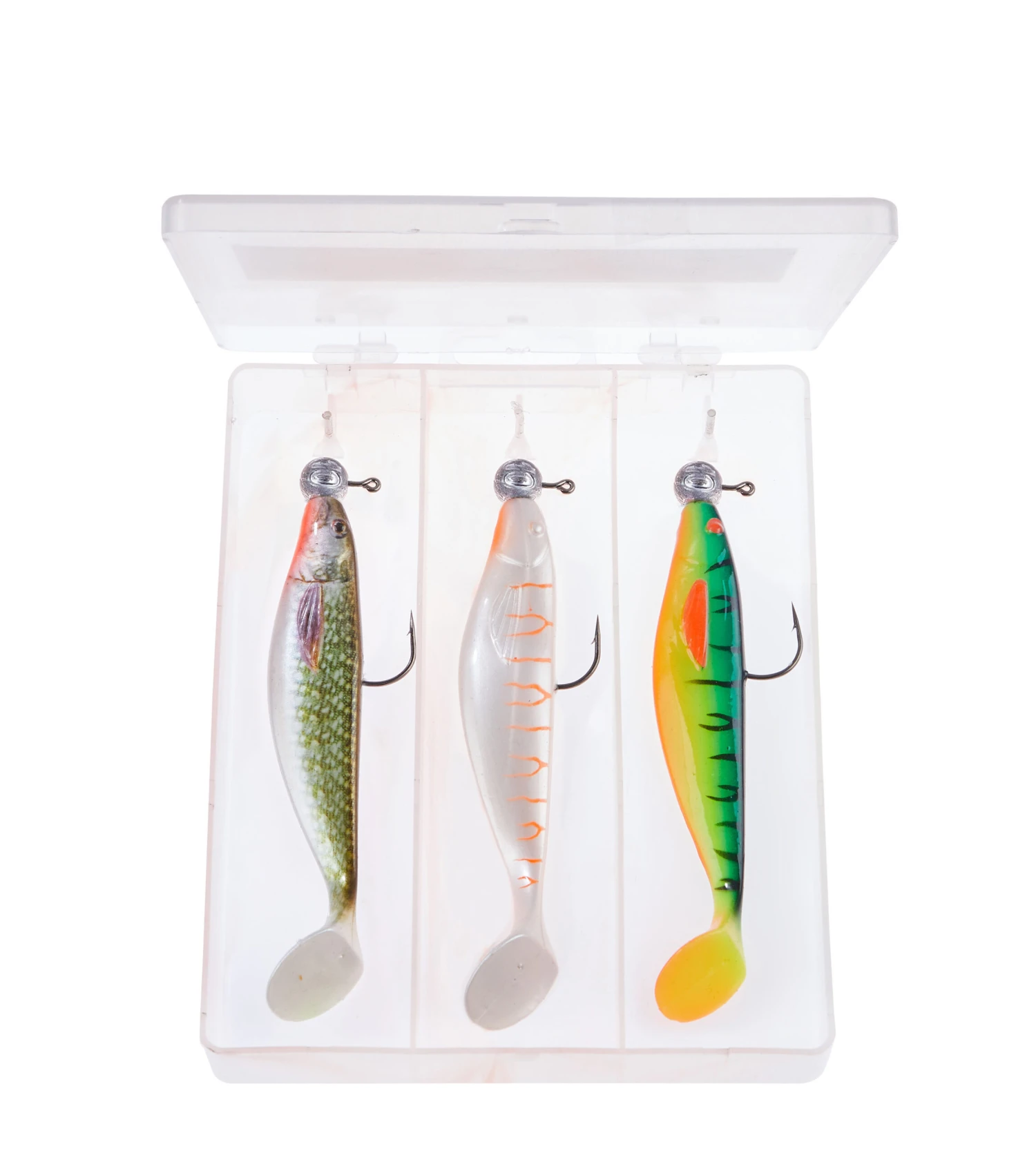 De shads in deze Box zijn 10cm lang en wegen 7 gram. De kleuren zijn Print Shad Hecht, Booster Shad Fireshark en MaJo Booster Shad Albino. Jigheads zijn haakmaat 5/0 en de gewichten 7,5g, 10g en 12,5g. Zo heb je voor elke situatie de juiste shad direct gereed!